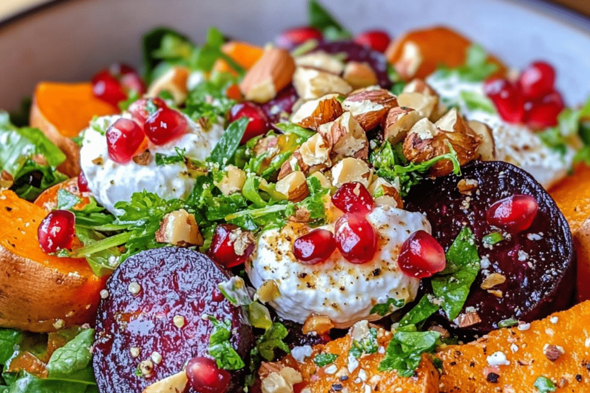 This vibrant Beet and Sweet Potato Salad is a delightful fusion of colors, flavors, and textures. The earthy sweetness of roasted beets and sweet potatoes pairs beautifully with the creamy whipped ricotta, while the tart burst of pomegranate seeds adds freshness and tang. A sprinkle of hazelnut crunch elevates the dish with nutty richness and satisfying texture. Perfect for special occasions or as an everyday treat, this salad is a versatile and visually stunning dish that is as nutritious as it is delicious.