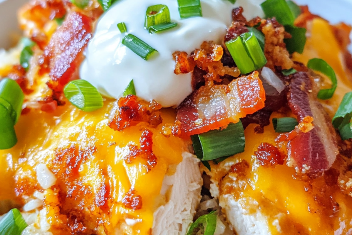 is the ultimate comfort food. This dish brings together tender, juicy chicken, perfectly cooked rice, and melty cheese, all infused with the savory flavors of ranch seasoning. The final touch is a crispy, golden bacon crumble, complemented by chopped green onions and a drizzle of tangy sour cream. It’s easy to prepare, incredibly satisfying, and perfect for any weeknight dinner or family gathering.