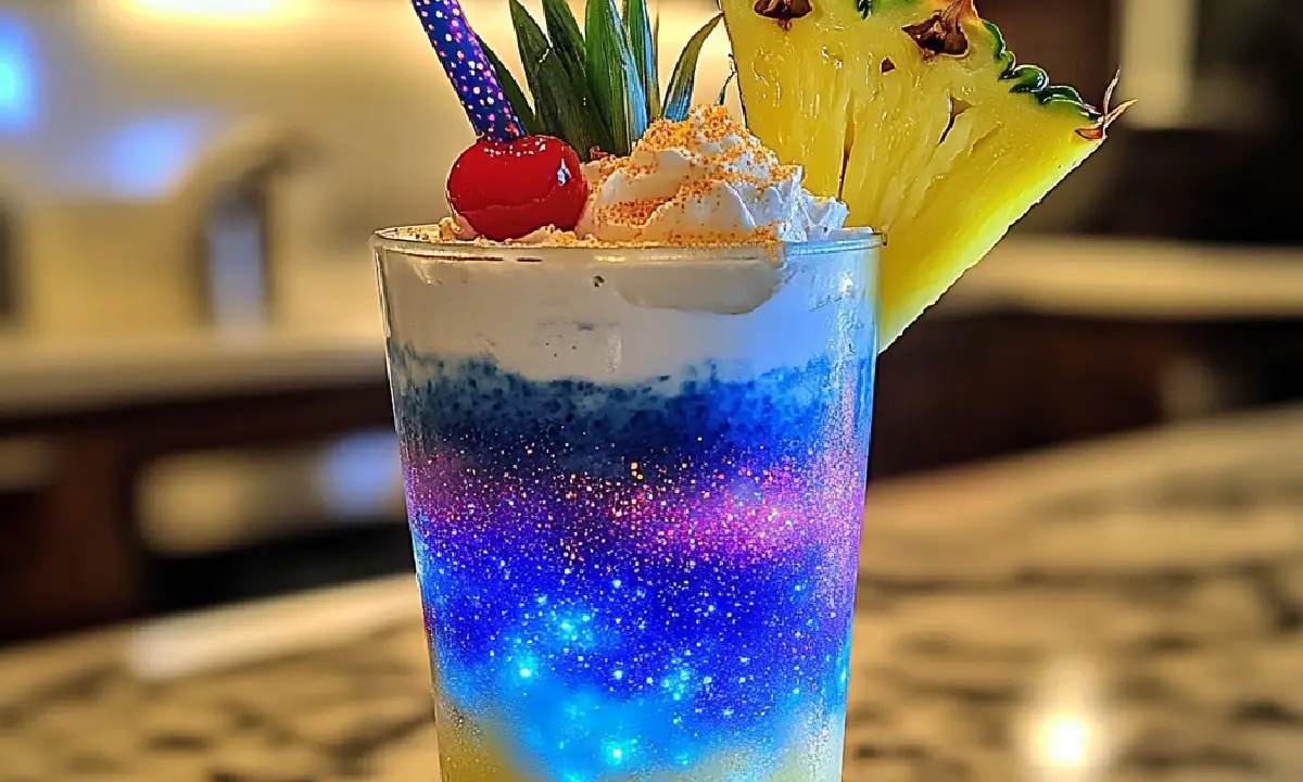 The Galaxy Piña Colada is not just a cocktail—it’s a dazzling experience that blends tropical flavors with a mesmerizing cosmic aesthetic. Inspired by the beauty of deep space, this drink takes the classic Piña Colada and elevates it with vibrant layers of blue curaçao and shimmering edible glitter. The combination of creamy coconut, tangy pineapple, smooth white rum, and citrusy lime creates a drink that’s both refreshing and visually stunning. Whether you’re hosting a themed party, looking for a drink that stands out, or simply want to indulge in something celestial, this cocktail is the perfect choice.