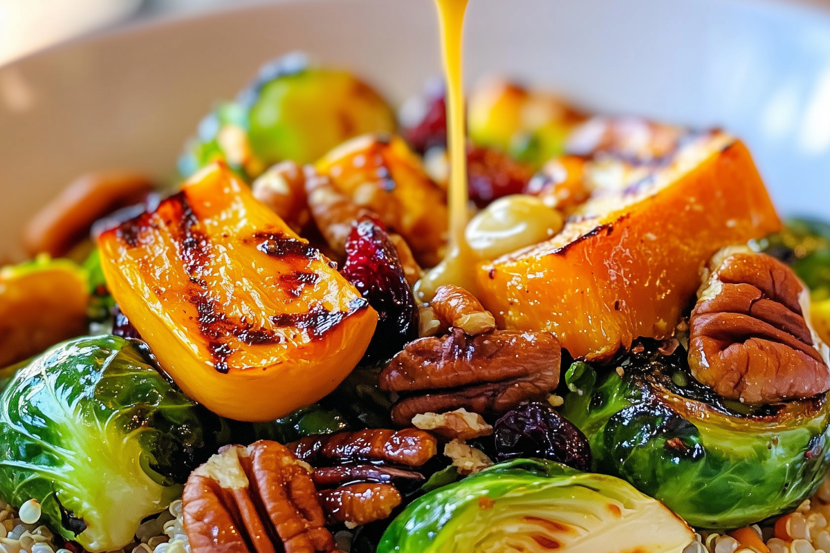 Grilled Brussels sprouts and butternut squash quinoa bowls are a nutrient-packed, flavorful, and hearty dish that is perfect for any meal. The combination of smoky Brussels sprouts, sweet butternut squash, crunchy pecans, and chewy dried cranberries creates a textural and flavor explosion that’s both satisfying and nourishing. The lemon garlic tahini dressing with maple syrup adds a creamy, tangy sweetness that perfectly complements the earthy tones of the grilled vegetables. This bowl is not only visually stunning with its vibrant colors but also a powerhouse of vitamins, minerals, and plant-based protein. Whether you’re looking for a healthy lunch, a cozy dinner, or a meal prep option, this recipe will quickly become a favorite in your kitchen.