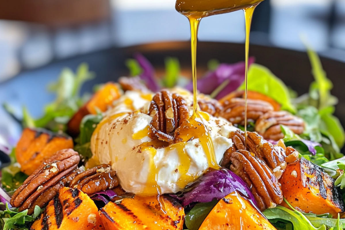 Grilled Sweet Potato Salad with Burrata, Maple Pecans, and Cinnamon Glaze is a symphony of flavors perfect for fall gatherings, summer barbecues, or any occasion where you want to impress with a unique, flavor-packed salad. This dish balances savory, sweet, creamy, and crunchy textures, creating an unforgettable culinary experience. The caramelized sweet potatoes are beautifully charred on the grill, paired with rich and creamy burrata, sweet and nutty maple pecans, and a luscious cinnamon glaze that ties it all together. This recipe is sure to become a favorite at your dining table.
