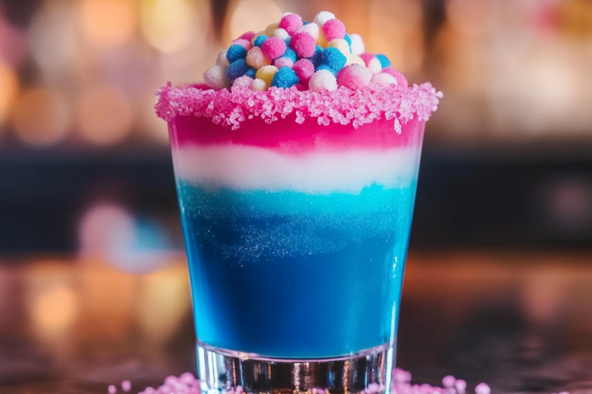 Serve the shot as soon as it’s layered and rimmed. Optional: top with a puff of cotton candy or a few edible glitter flakes for extra flair. Encourage guests to shoot it all at once or sip it to experience each layer.
