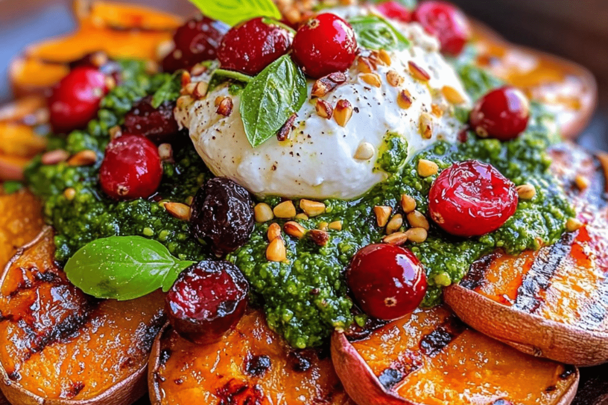 Holiday Grilled Sweet Potato and Burrata Salad with Cranberry Pepita Pesto