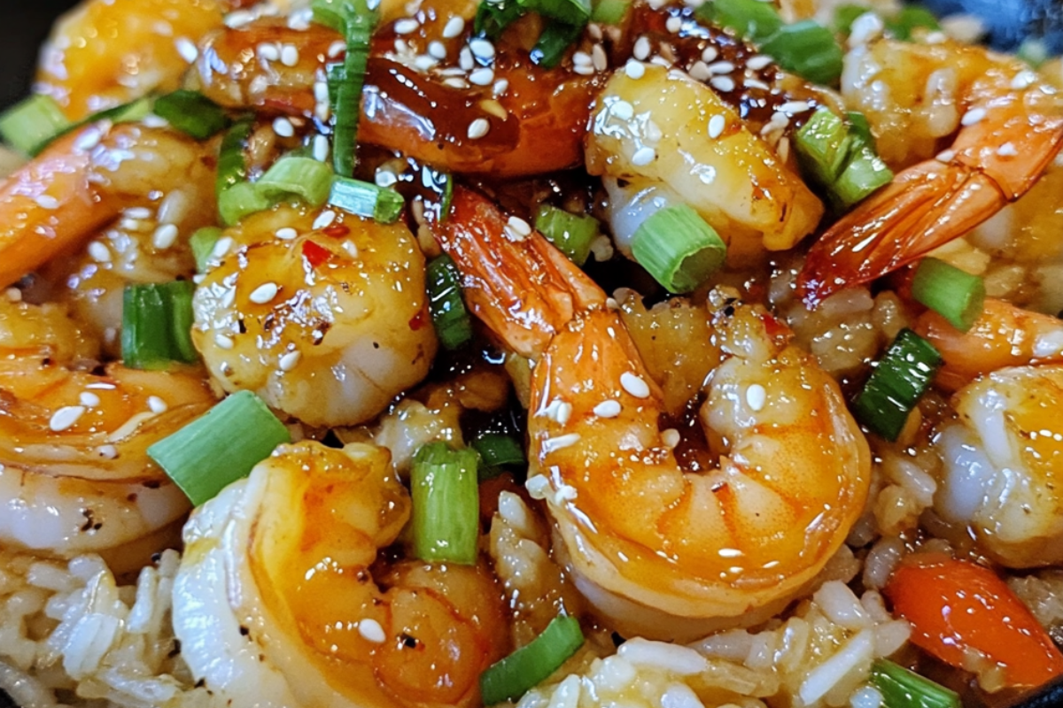 - Pour the prepared honey garlic sauce over the shrimp and rice.