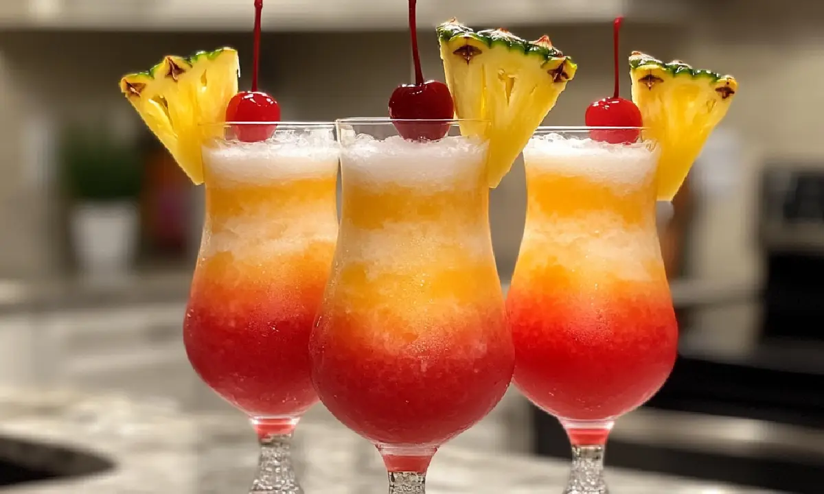 Stunning Presentation: The Malibu Sunset isn’t just a drink—it’s a visual masterpiece. Its signature layered effect, moving from bold red at the base to glowing gold at the top, mimics the breathtaking hues of a real sunset. Served in a clear glass, this cocktail becomes a conversation starter, an Instagram-worthy centerpiece, and an instant mood-lifter. Garnishes like a maraschino cherry and pineapple wedge complete the look, making each glass a small piece of tropical art.