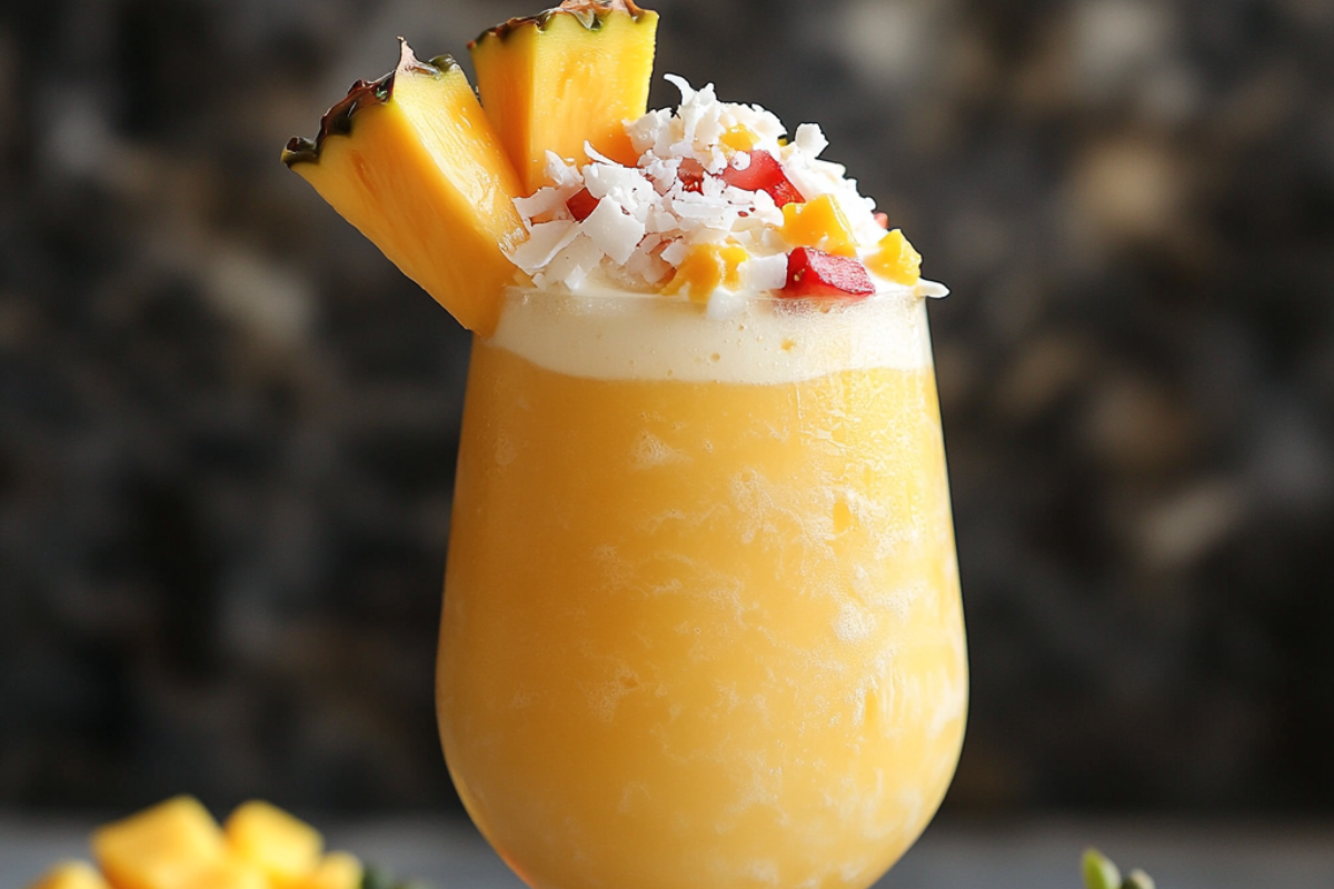 - Garnish: Fresh mango slices, strawberries, and a pineapple wedge
