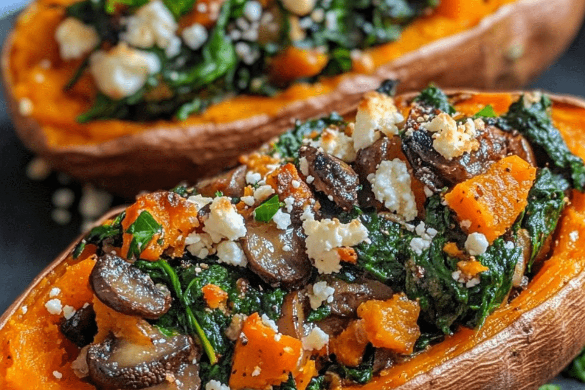 ROASTED STUFFED SWEET POTATOES WITH SAUTÉED SPINACH, MUSHROOMS & FETA