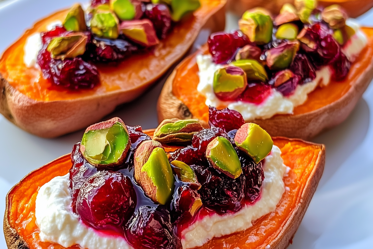 Roasted Sweet Potatoes with Ricotta, Candied Pistachios and Cranberry Glaze