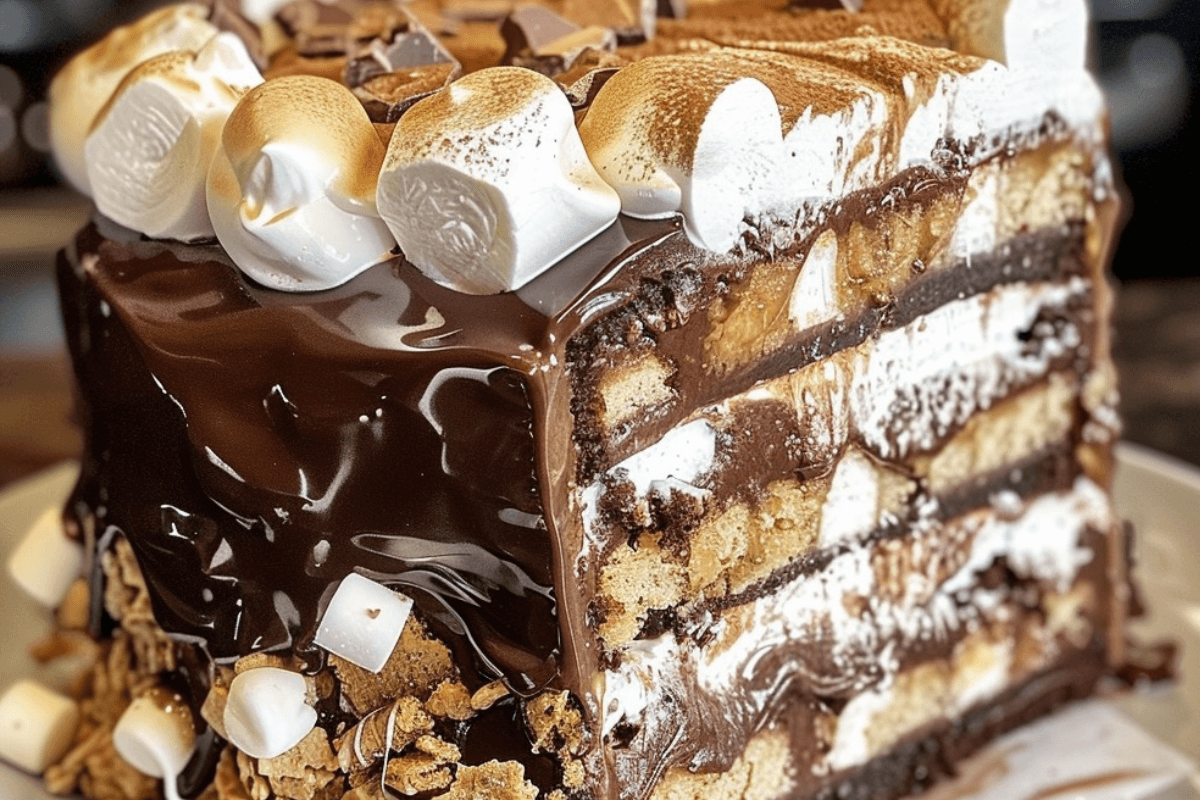 Place one layer of chocolate cake on a serving plate. Spread a generous amount of marshmallow filling evenly over the cake layer. Place the second cake layer on top and repeat with another layer of marshmallow filling. Top with the final cake layer. Pour the cooled chocolate ganache over the top of the cake, allowing it to drip down the sides for that signature “s’mores” look.