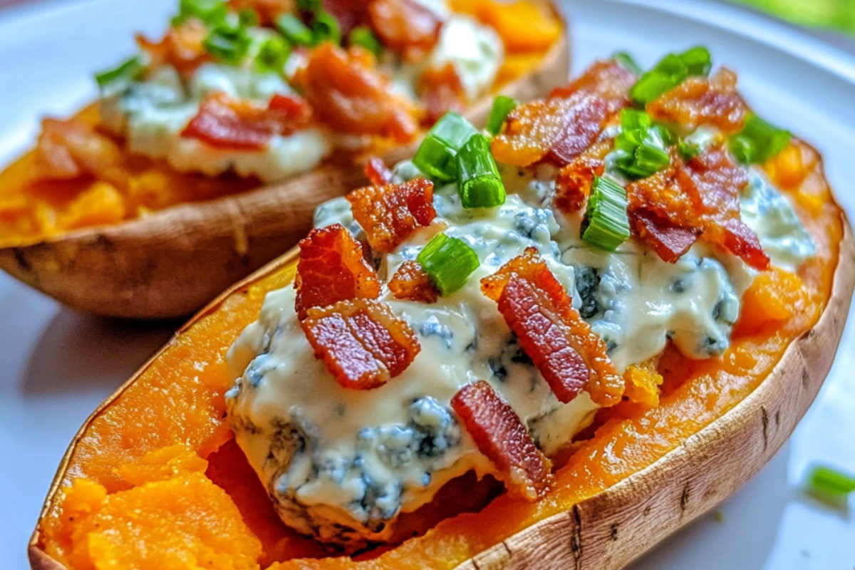 Stuffed sweet potatoes are a fantastic way to elevate a simple vegetable into a decadent and satisfying dish. This recipe brings together a medley of bold and savory flavors—creamy blue cheese, crispy bacon, and a tangy chive-infused sour cream topping. The natural sweetness of the roasted sweet potatoes perfectly balances the intense, salty notes of blue cheese and bacon, while the fresh chive cream adds a cooling and refreshing finish. This dish is perfect for those who appreciate robust flavors and a rich, comforting meal. It works beautifully as a side dish or even a main course, depending on the occasion.