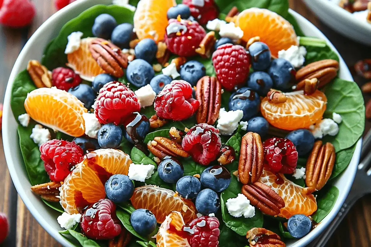 Thanksgiving Salad with Spinach, Blueberries, Raspberries, Mandarin Oranges, Pecans, Feta, and Honey-Balsamic Dressing