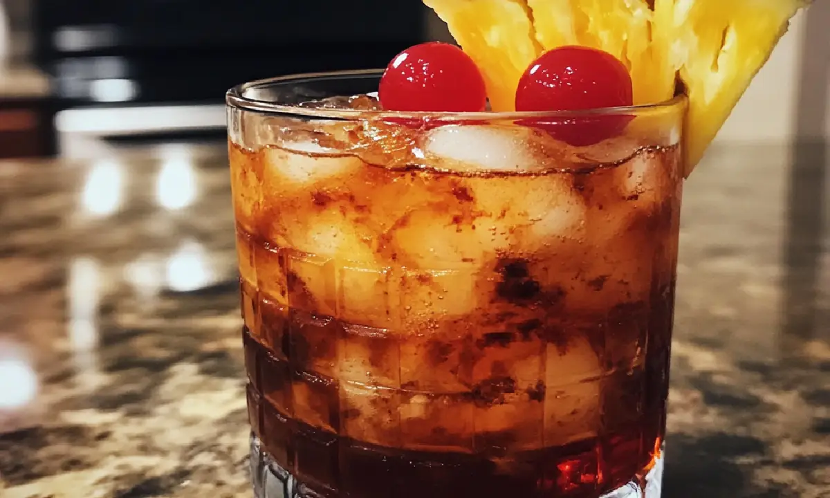 Garnish: Pineapple wedge, maraschino cherry, and a cocktail umbrella (essential for tropical vibes!)