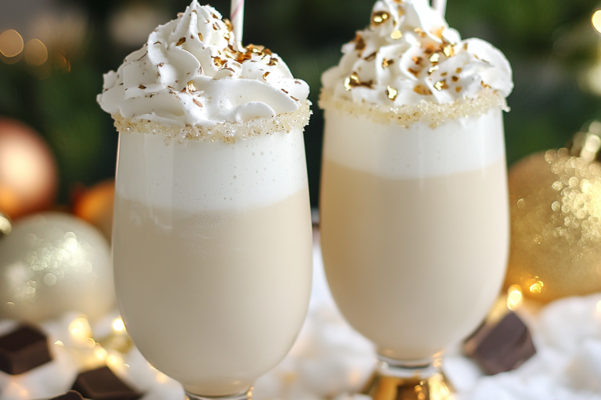 Top with a dollop of whipped cream, white chocolate curls, and a sprinkle of edible glitter for an elegant and festive finish. Serve immediately and enjoy!