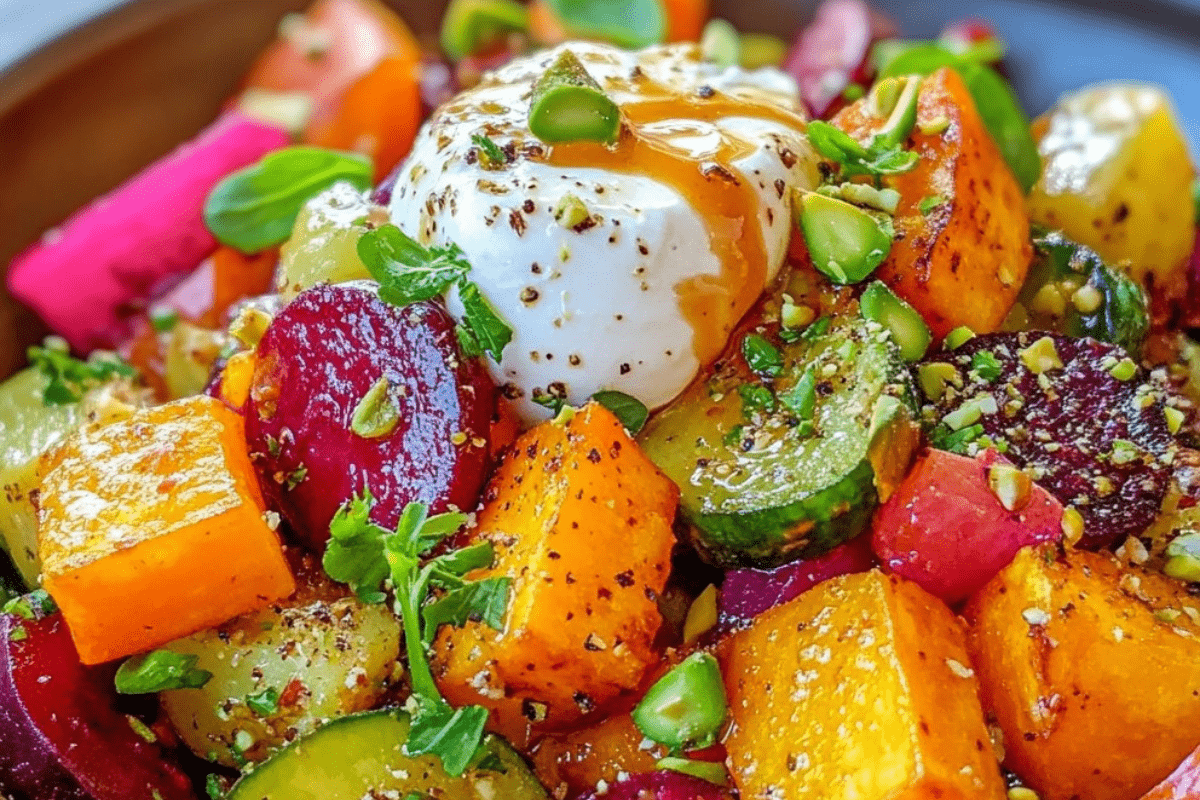 Warm Beet and Sweet Potato Salad with Burrata, Dijon Maple Glaze, and Pistachio Dust