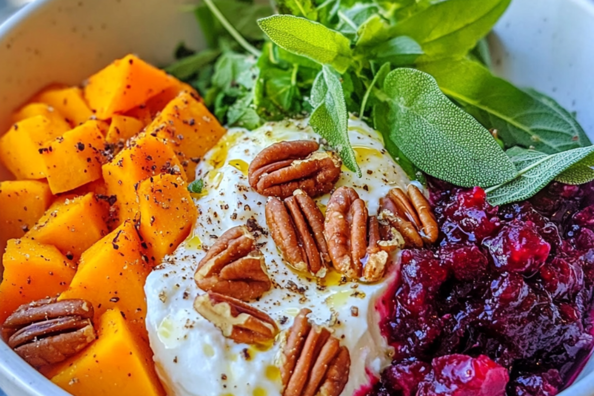 This Creamy Beet & Sweet Potato Bowl with Burrata, Spiced Pecans, and Maple Tahini is a luxurious yet wholesome dish that balances earthy, creamy, sweet, and tangy flavors. It’s perfect as a warming autumn dish or a festive main course for gatherings. The roasted beets and sweet potatoes provide a soft, comforting base, while the creamy burrata adds a decadent touch. The spiced pecans give it a crunchy texture, and the maple tahini dressing binds all flavors together with a nutty sweetness. Finally, a cranberry sage drizzle adds a pop of color and a refreshing hint of herbal flavor.