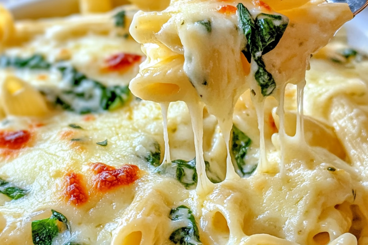 Creamy Three-Cheese Baked Penne Alfredo with Basil and Spinach