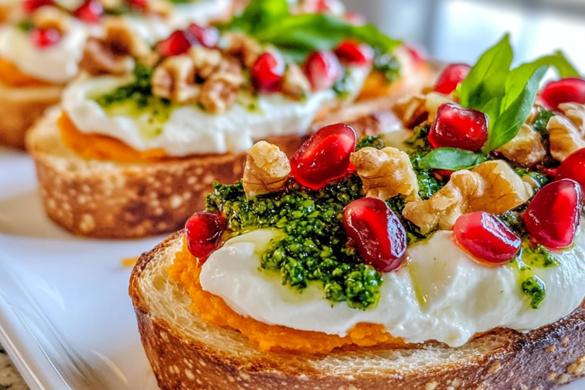 Holiday Sweet Potato Crostini with Burrata, Pomegranate Seeds, and Rosemary Pesto