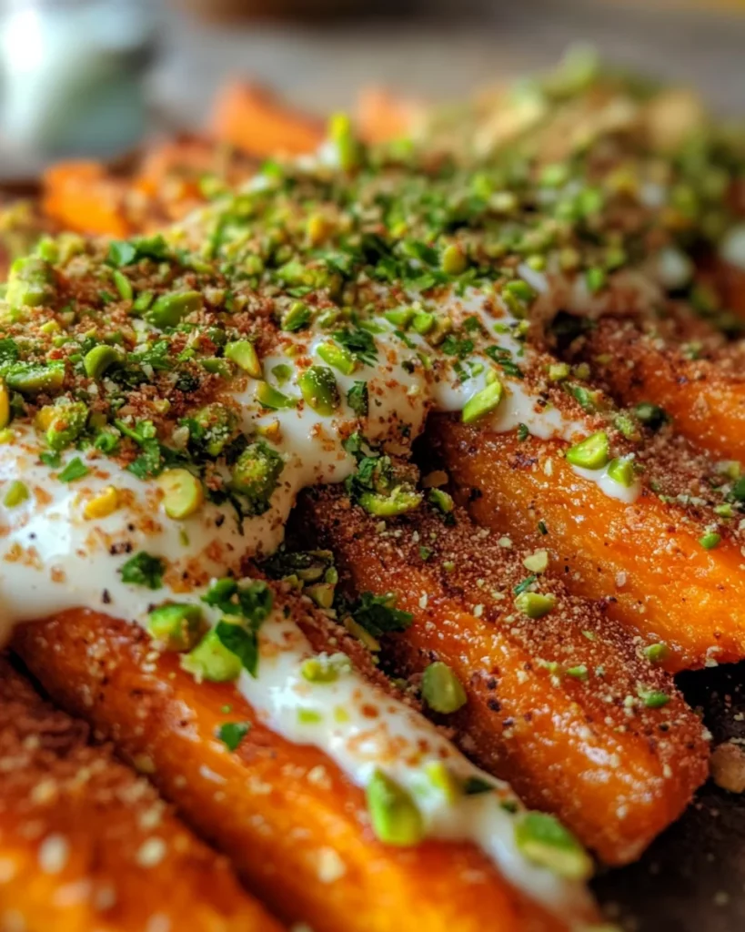 Pistachio-Crusted Sweet Potato Fries with Labneh are a colorful and delicious dish that combines the earthy sweetness of sweet potatoes with a nutty pistachio crust and a creamy labneh drizzle.