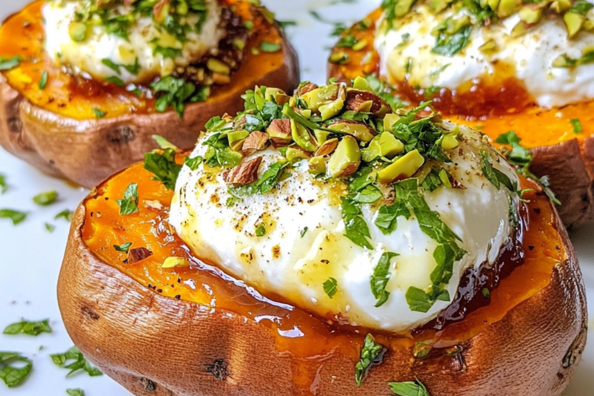 Stuffed Sweet Potatoes with Burrata, Fig Jam, and Pistachio Dust is an exquisite, flavor-packed dish that effortlessly combines creamy, sweet, and crunchy elements. It’s an ideal recipe for both seasoned home cooks and kitchen beginners, with its simple preparation yet gourmet presentation. This dish showcases how a few high-quality ingredients can transform a meal into something extraordinary.